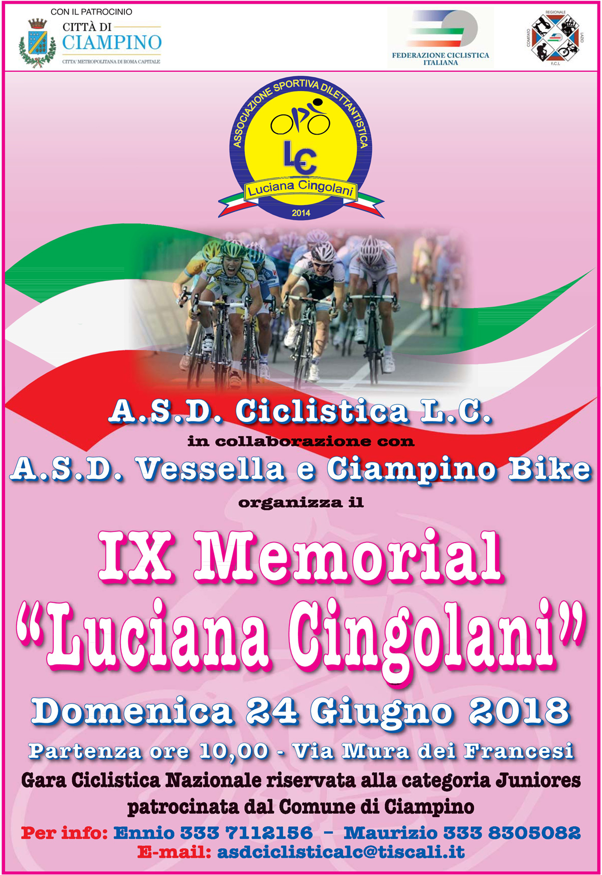 Domenica 24 giugno 2018 si svolgerà la gara ciclistica Memorial Cingolani, giunta alla nona edizione, che interesserà i comuni di Ciampino, Marino e Castel Gandolfo, secondo le indicazioni di seguito riportate. La manifestazione sportiva avrà inizio alle ore 10.00 e terminerà alle ore 13.30. A partire dalle ore 05.00 del mattino e comunque fino alle ore 16.00 dello stesso giorno ci saranno delle limitazioni alla circolazione come di seguito riportate. La manifestazione sportiva è stata autorizzata con provvedimento del Sig. Prefetto di Roma, prot. 02333021 del 18/06/2018 ai sensi del D. Lgs. 285/1992, art. 9, richiamando altresì la concessione allo svolgimento della gara rilasciata da ASTRAL con propria nota n. 0020525/15/16/2018.