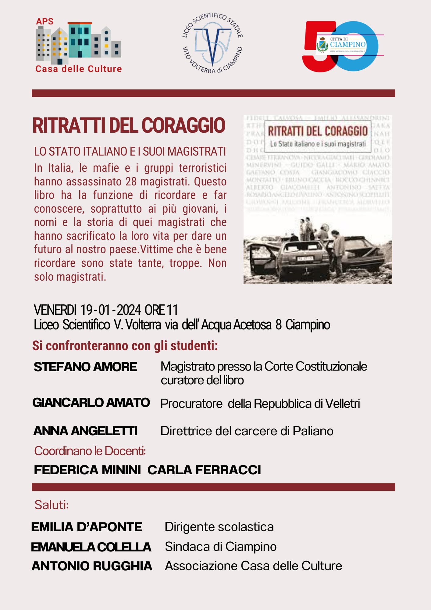 Lo scorso venerdì 19 gennaio, nell’auditorium del prestigioso Liceo Scientifico “Vito Volterra” di Ciampino, si è tenuto l’importante evento “Ritratti del Coraggio – lo Stato italiano e i suoi magistrati” promosso dall’Associazione Casa delle Culture, Presidente On. Antonio Rugghia, anche con la collaborazione del nostro Comando di Polizia Locale che, tra l’altro, svolge periodicamente corsi di educazione alla legalità e sicurezza nello stesso istituto scolastico.